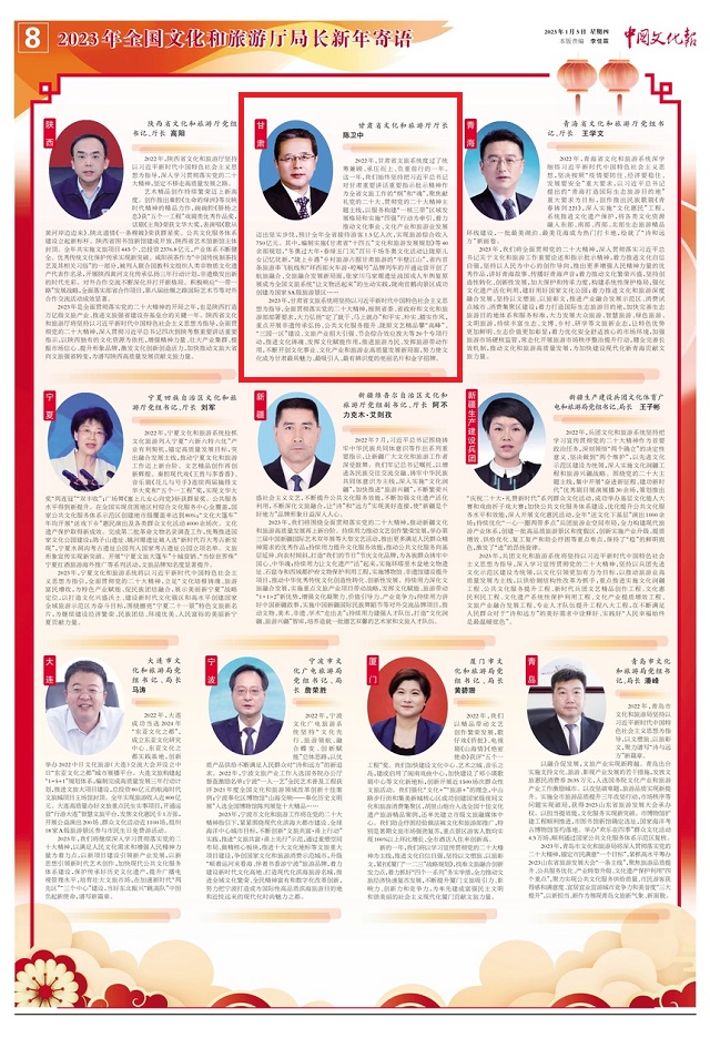 1月5日,2023年全国文化和旅游厅局长会议召开。会议召开之际,中国文化报在5至8版特别推出“2023年全国文化和旅游厅局长新年寄语”特刊,邀请各省区市、新疆生产建设兵团和计划单列市的文化和旅游厅局长们介绍2022年文化、旅游工作的亮点,展望2023年的新发展、新期待。