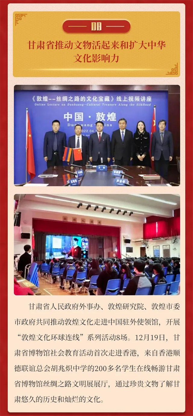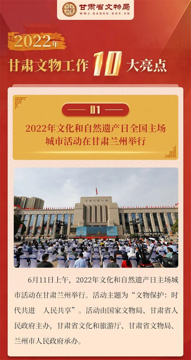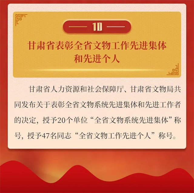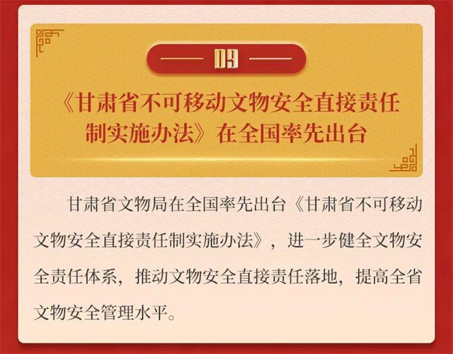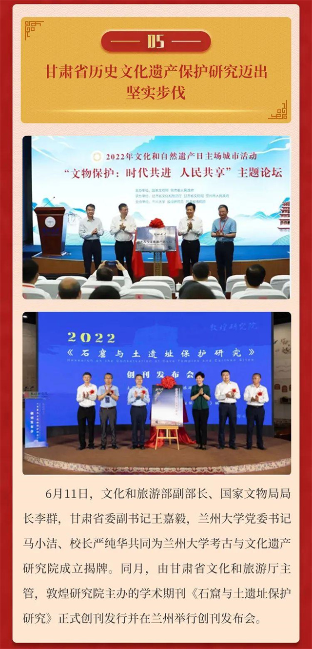 2022年,全省文物工作在省委省政府的坚强领导下,在国家文物局的大力指导下,以迎接宣传贯彻党的二十大精神为主线,以深入贯彻落实习近平总书记关于文物工作重要论述和指示批示,特别是在敦煌研究院座谈时的重要讲话精神为遵循,守正创新,团结奋斗,文物事业发展书写浓墨重彩的崭新篇章。