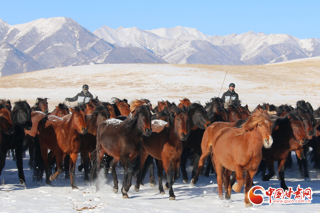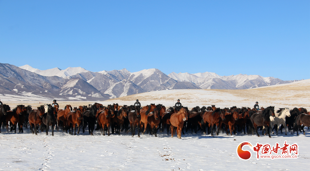 2月9日,在甘肃山丹马场,上演了万马奔腾的壮观景象,健壮的马蹄溅起阵阵飞雪,实属震撼。