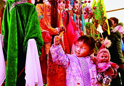 演出使用的木偶引起了小观众的好奇 李三良 摄