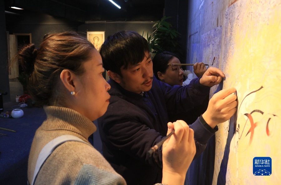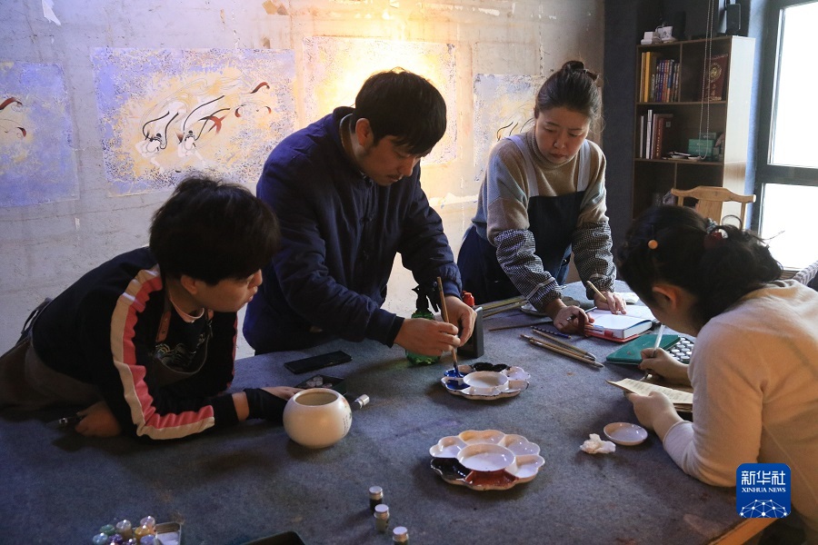 2月22日,在敦煌小镇鸣沙书院,艺术工作者张杰龙(中)指导学员临摹敦煌壁画。新华社发(张晓亮 摄)