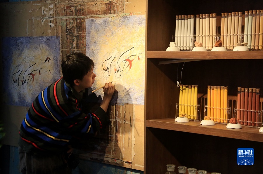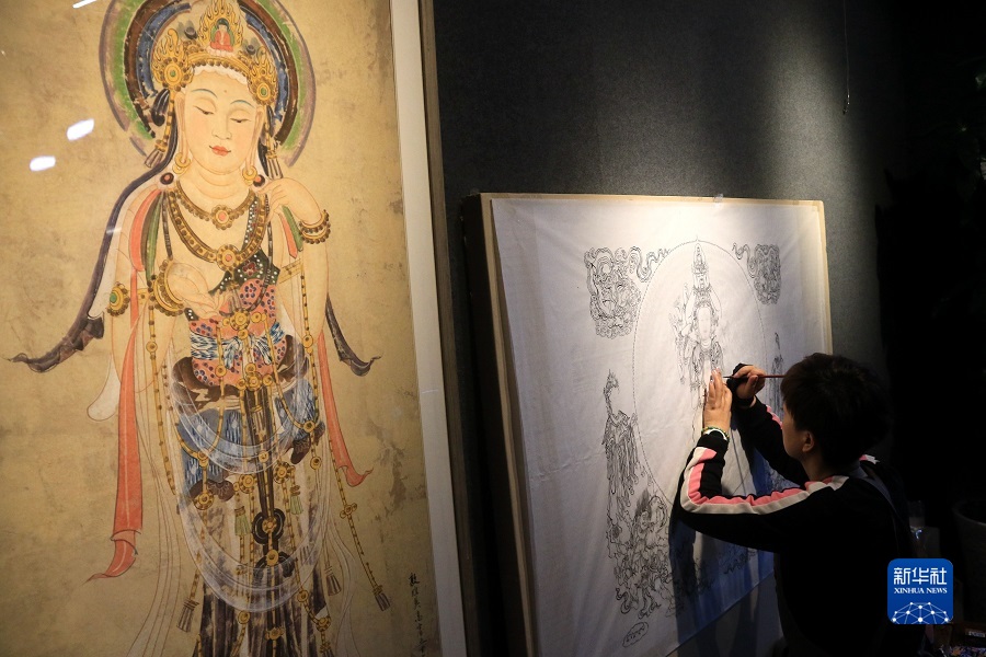 2月22日,在敦煌小镇鸣沙书院,来自陕西的学员吴恩梵学习敦煌壁画临摹技艺。新华社发(张晓亮 摄)