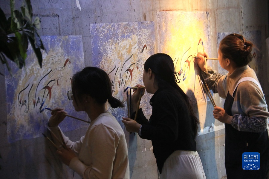 2月22日,在敦煌小镇鸣沙书院,学员学习敦煌壁画临摹技艺。新华社发(张晓亮 摄)