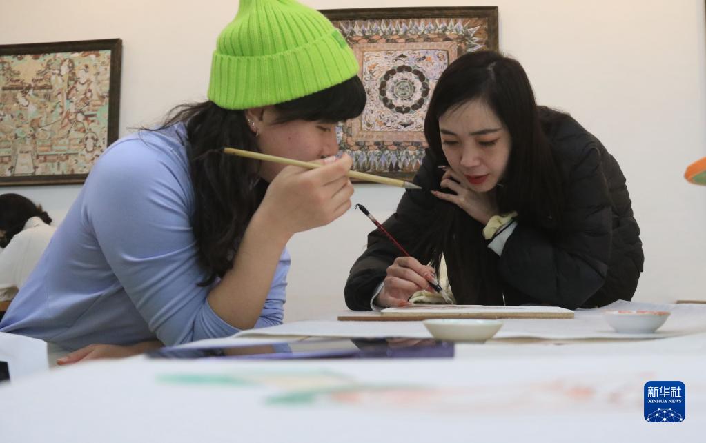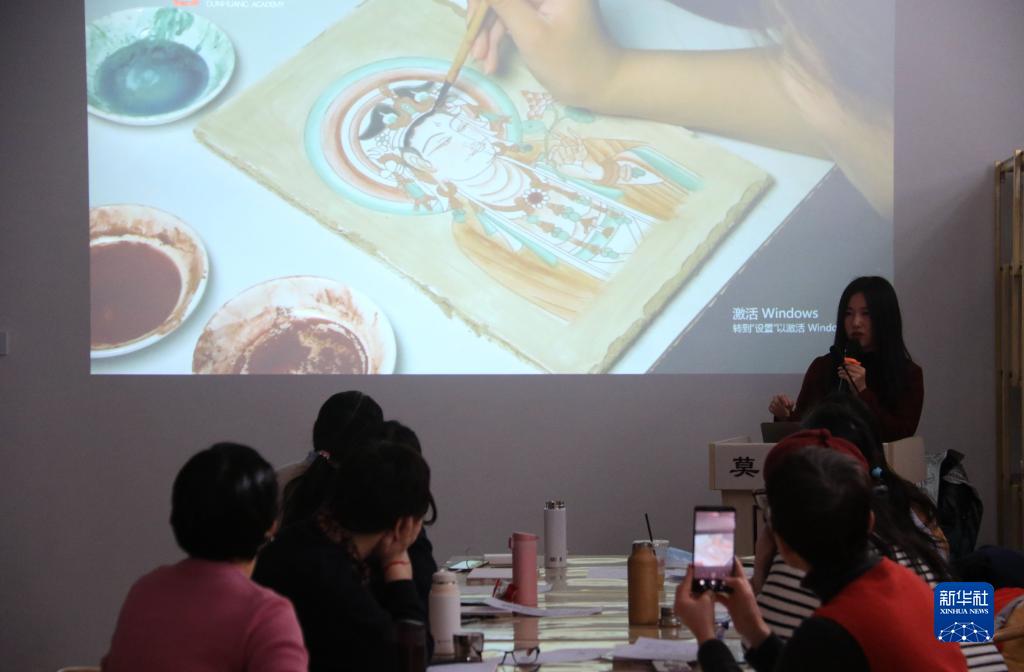 2月23日,在敦煌研究院莫高学堂,研学导师给学员讲授敦煌壁画临摹技法。新华社发(张晓亮 摄)