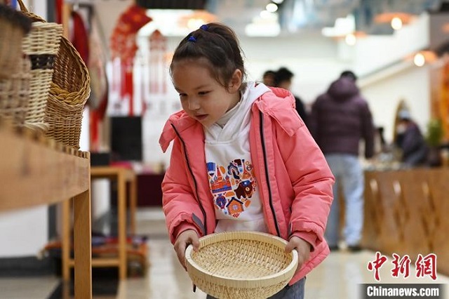 资料图为甘肃省兰州市一非遗产品展厅内,外国小朋友在挑选非遗产品。