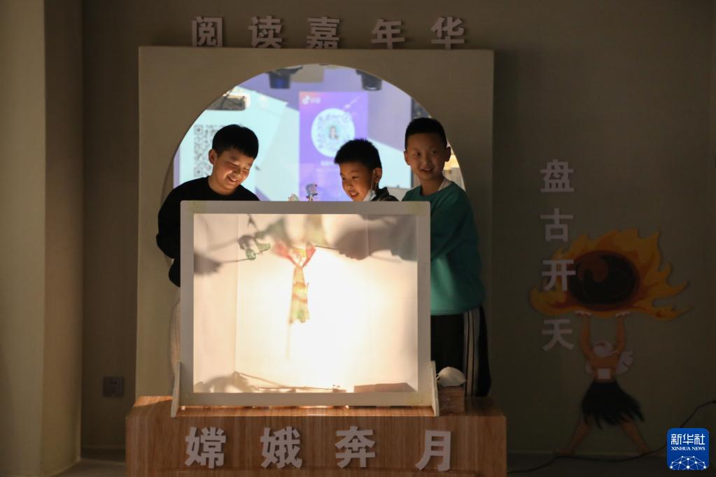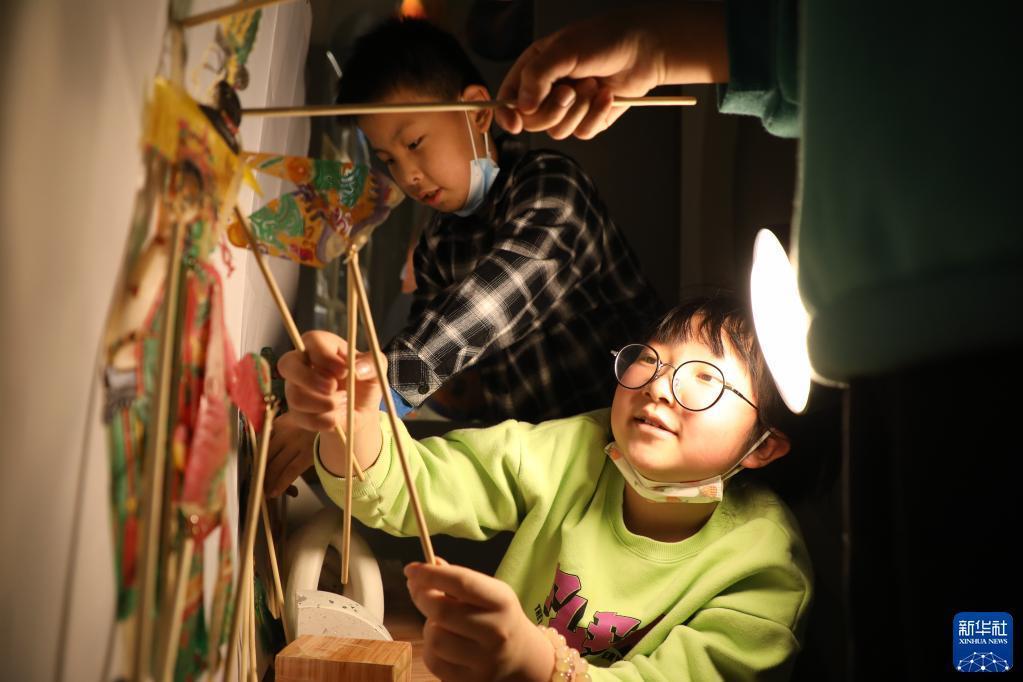 4月1日,在甘肃省兰州市的读者出版集团数字阅读中心读者小站,小朋友体验中国神话故事主题皮影戏。新华社记者 马希平 摄