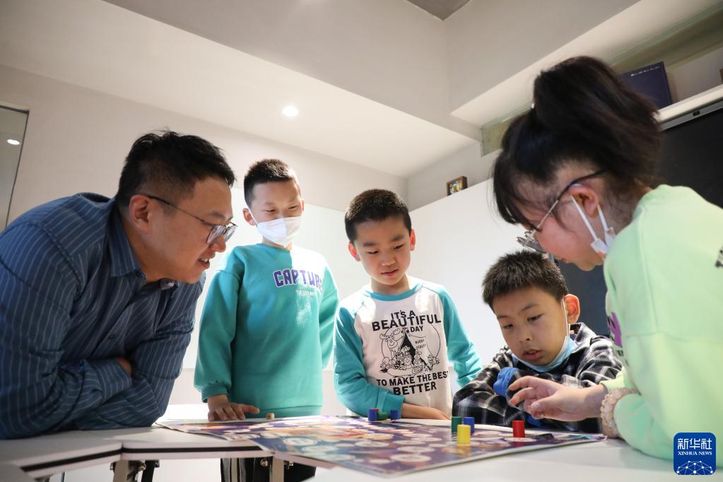 4月1日,在甘肃省兰州市的读者出版集团数字阅读中心读者小站,工作人员与小朋友一起玩“讲述中国神话故事”的飞行棋游戏。新华社记者 马希平 摄