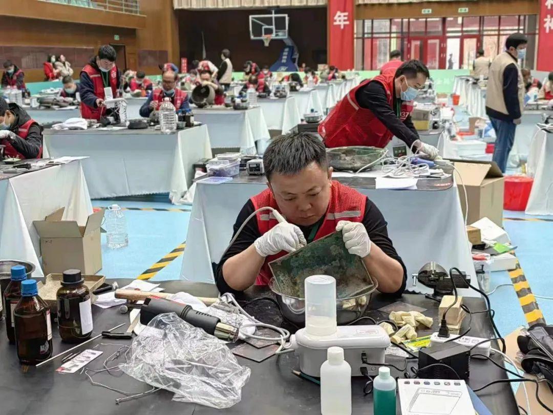 金属文物修复选手面对不同形状、不同年代、不同用途和不同残破程度的文物,修复过程需要选手对文物实际情况进行全面了解,采取相应的修复措施,并保证文物安全。甘肃省选手张伟抽到的修复文物是一件变形严重且带有缺失花纹的青铜簋,他对整体变形的青铜簋进行逐步矫正,并对缺失的纹饰进行补配粘接,最终将一件精美的文物呈现在评委面前。
