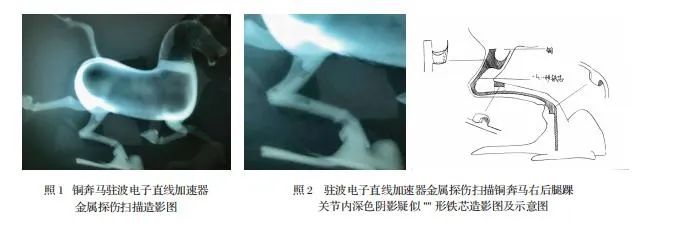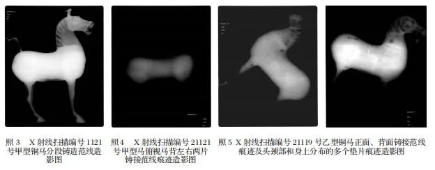 与铜奔马一起出土的铜车马仪仗队,根据造型分为甲型马匹和乙型马匹,也各取一件样品做了X射线探伤扫描分析。扫描图显示两种马均系陶范法分段铸接而成,其工艺是分铸马头、身躯、腿足后,再铸接成一体,马头颈实心,空腹,腹下有一椭圆形口,铜腿内铸夹铁芯骨。甲型马的身躯部分是左右两片铸接而成,铜质纯净,铸工精细,身上范铸垫片痕迹不清,身躯高大矫健,耳较长,直立向上,尾做弧形,末端打结,收尾处细长,马身无铭文(照3、4)。乙型马的身躯部分是前后两段铸接而成,铜质不纯,铸工粗糙,身上范铸垫片痕迹清晰可见,形体肥壮,耳较短而前倾,马尾扁平弯曲,身材各部位比例均不及甲型马,前胸刻有铭文(照5)。