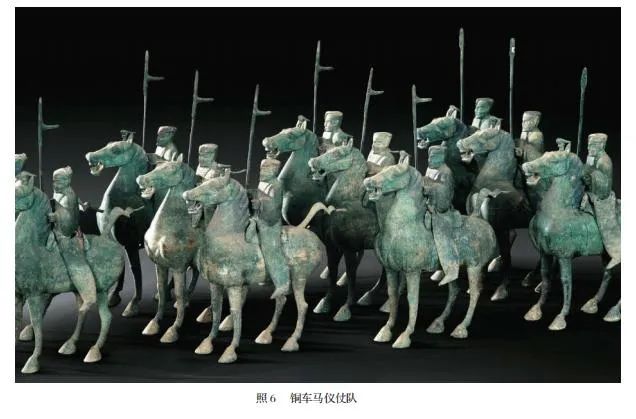 但是,铜奔马的造型姿态与其它随葬车马完全不同,其它马俑均为伫立静姿(照 6),而铜奔马则呈扬蹄飞奔状,与整装待发的铜车马仪仗队无法形成统一阵列和风格。这匹非同寻常的铜奔马,或许是专门设计铸造出来的一件特殊器物,它不属于随葬的这套铜车马仪仗队器物组合,而是墓主人生前特制的一件物品。自商周以来,征战中都少不了骏马,秦汉以前,人们就崇尚“马神”。汉武帝时更加重视养马,因而产生了对“马祖神”的崇拜与祭祀。