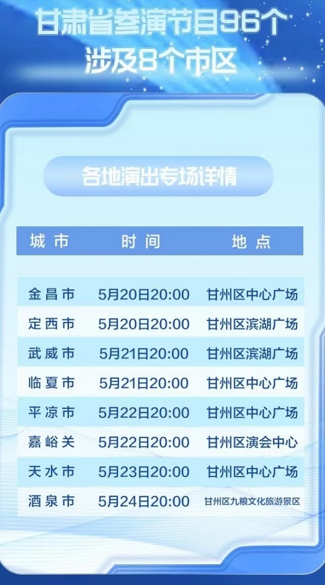 本次活动以“展文化、办演艺”为主要形式,来自金昌、定西、武威、临夏、平凉、嘉峪关、天水、酒泉等地的96个精品文艺节目将轮番登场。不同地方特色的文艺展演,既展现了甘肃深厚的历史文化底蕴,又展示了张掖热情好客的城市形象,是积极宣传甘肃文化、传播推广甘肃的具体举措。已经结束的6场演出共计现场观看人数2.4万人次,线上直播播放量达60多万人次。(文/甘肃省文化馆 孟丽炎 甘肃省文化和旅游厅 申珍示)