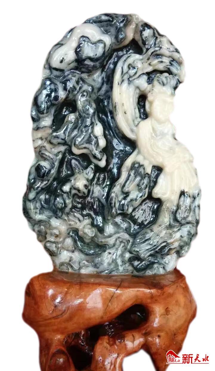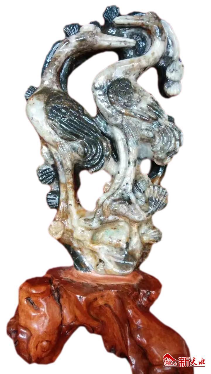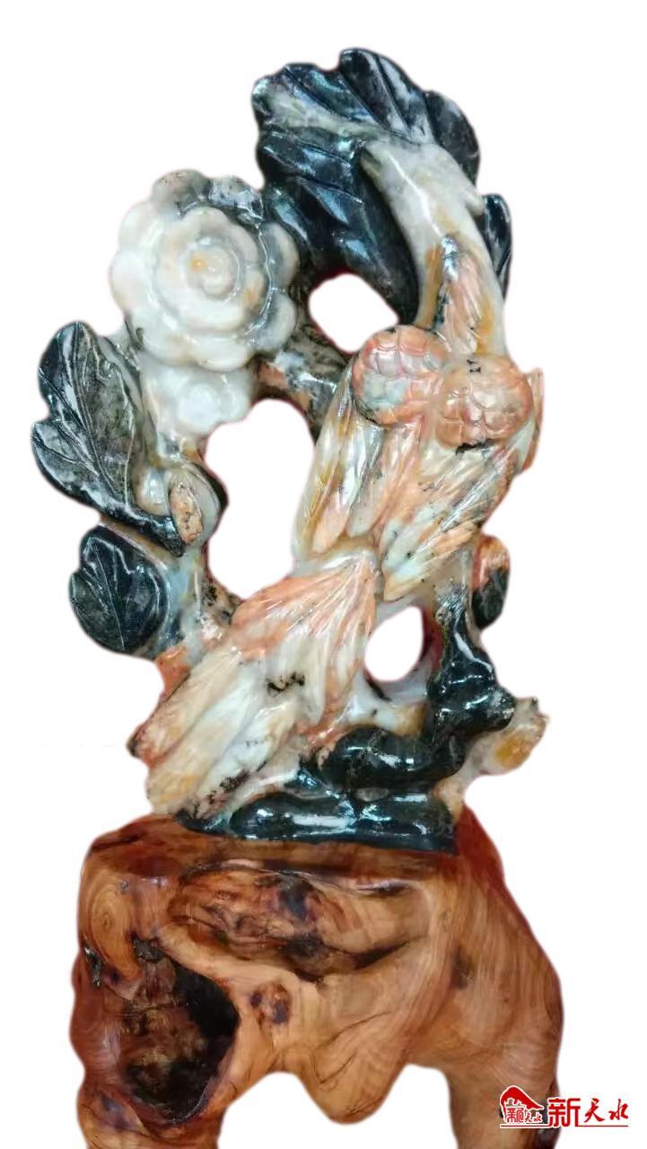 雕刻完成后,打蜡是必不可少的环节,即用高温喷枪将玉石喷热,然后将蜡涂抹在玉雕上,蜡油经高温很快就渗入玉体中,庞公玉随之发生神奇的变化,墨绿的颜色瞬间变得耀眼夺目,而玉雕上或黄色,或红色的玉翠也会变得愈发清晰可辨。接着还需配置与主体相呼应的木质或石质底座,这时天然庞公玉已成为一件精致的艺术品。但这并不代表作品的创作已经完成,最后还需要篆刻一个含蓄且富有诗意的名称或诗句在底座上,以达到虚实互补的效果。