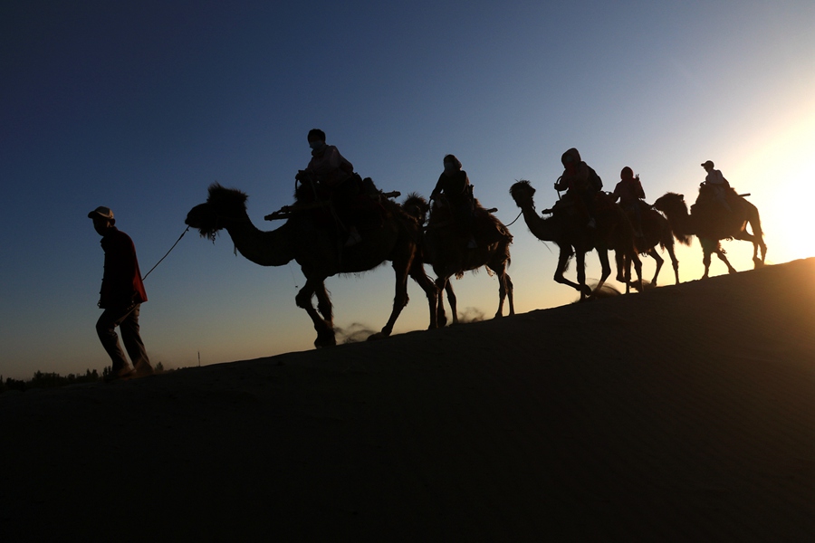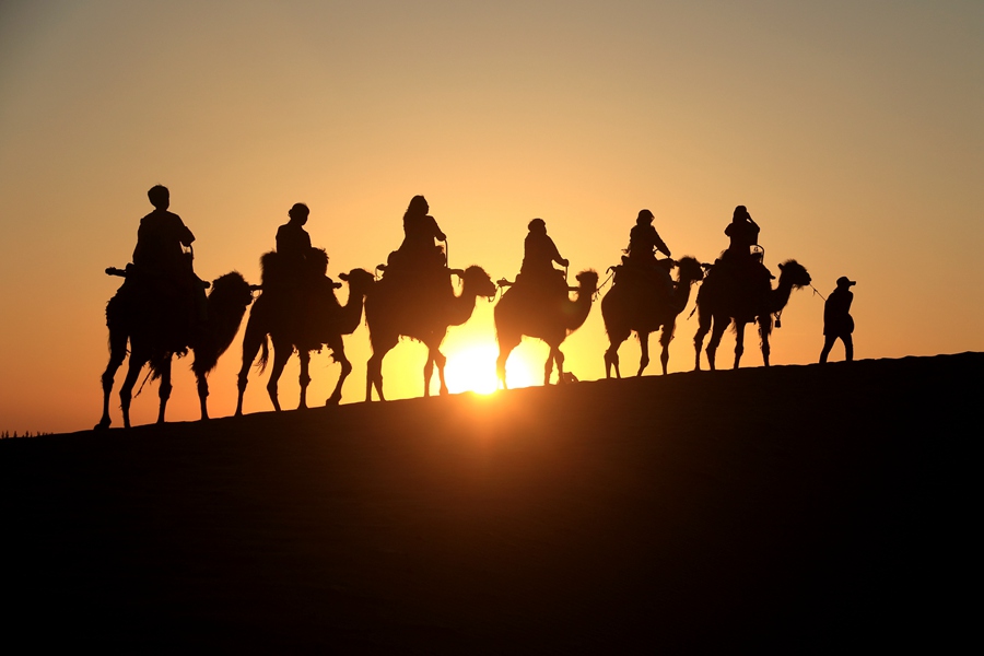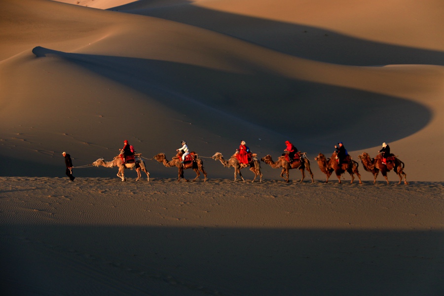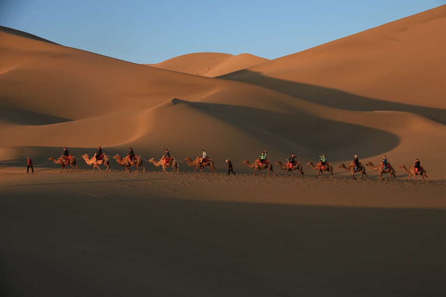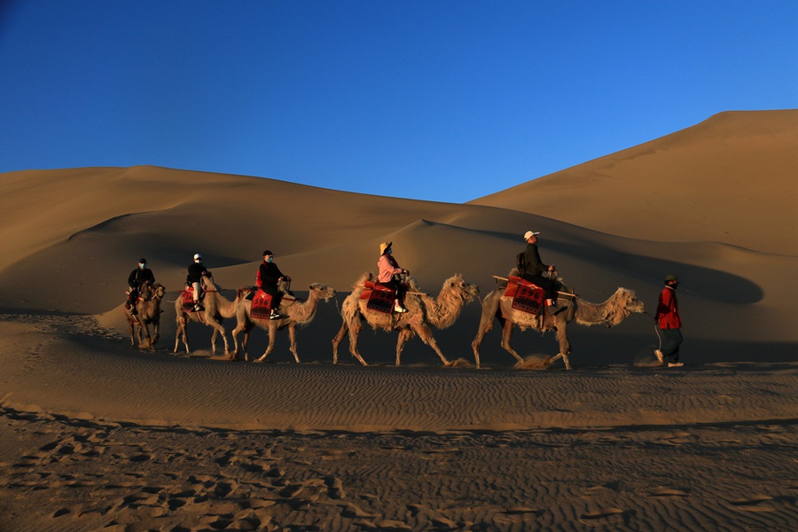 夏日清晨,甘肃省敦煌市鸣沙山月牙泉景区晨光如画,美不胜收,游客徜徉其中,欣赏大漠风光,体验丝路风情。 (记者 黄帆)