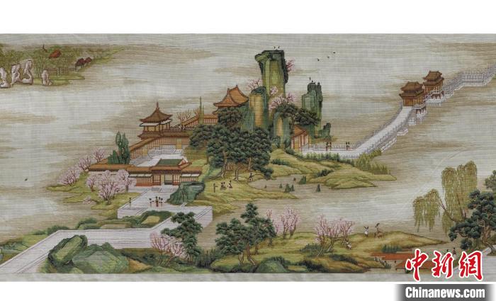 图为刺绣《清明上河图》局部,展现繁华街景。 岳文斌 摄