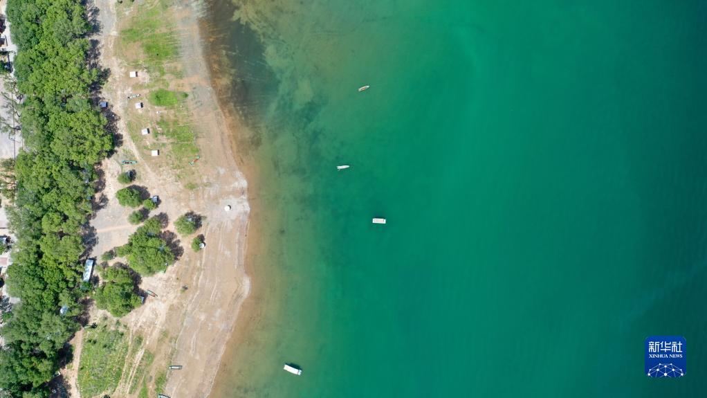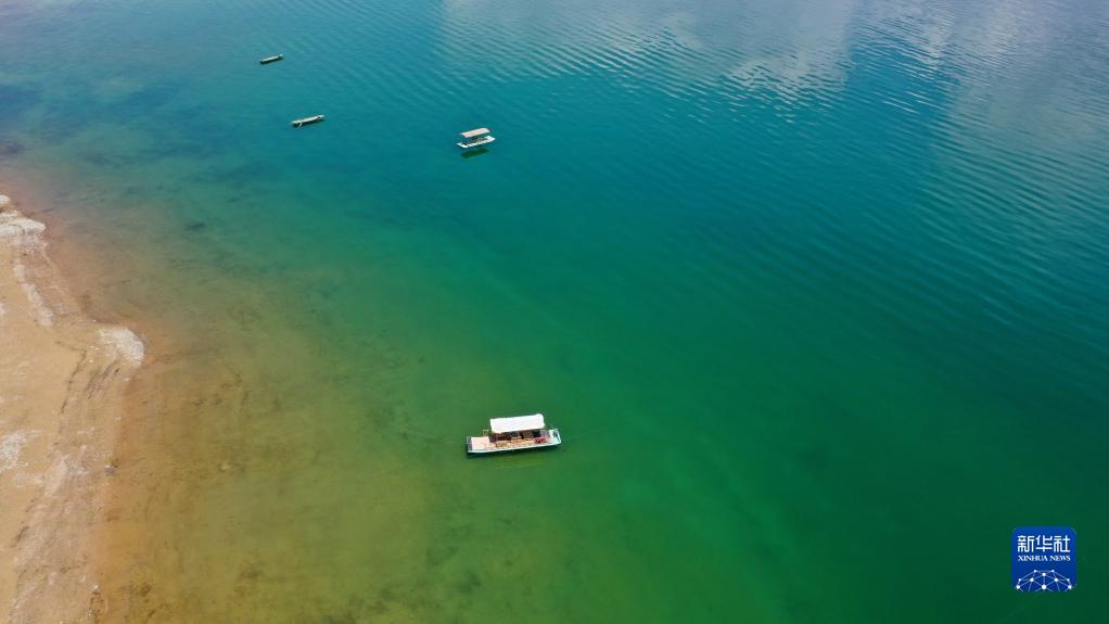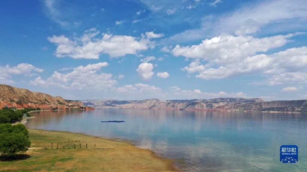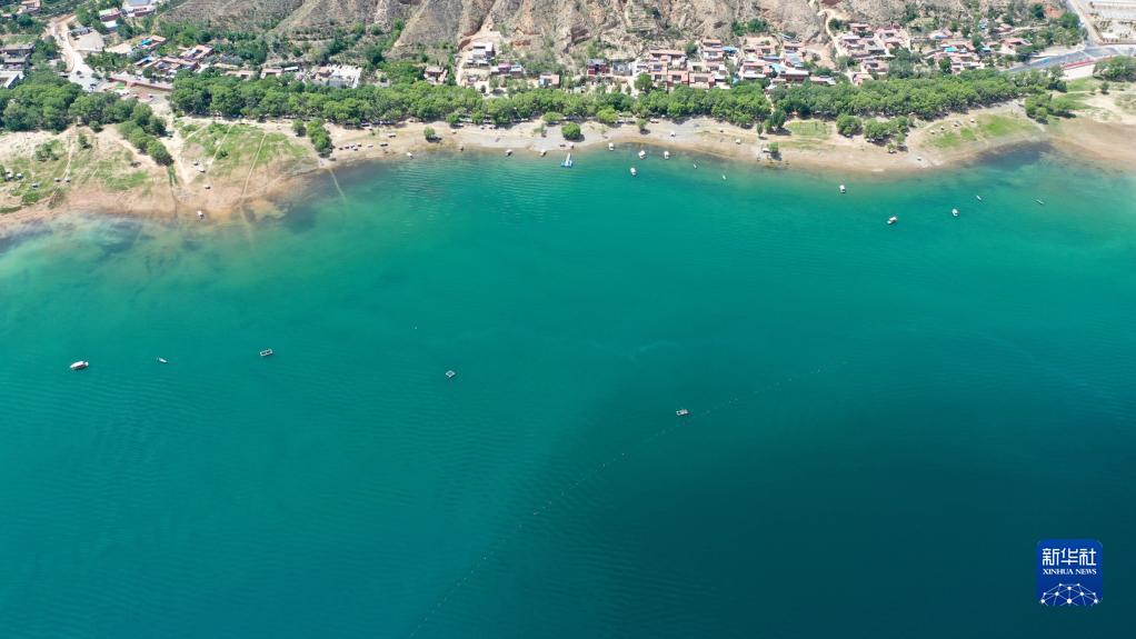 位于甘肃省临夏回族自治州永靖县境内刘家峡水库的黄河三湾碧波荡漾、岸线蜿蜒,片片小舟在水面摇曳,呈现一幅夏日清新画卷。