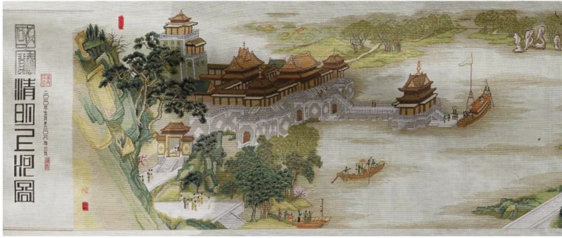 巨幅刺绣右端起首是春意方浓的宋朝汴梁郊外,新柳丛萃,阡陌纵横,稀疏的驮畜和人物蹒跚行进,从四面八方向闹市集中,充满生机勃勃又轻松宁静的气息。