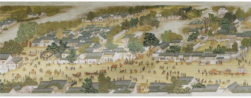 画幅末端是城东门内的市区街道,以高大的城楼为中心,两边的屋宇鳞次栉比,有茶坊、酒肆、脚店、肉铺、庙宇、公廨等等,车骑轿辇,担驮推拉,虽然人流熙来攘往,却显得井然有序,活泼舒展,把一派商业都市的繁华景象绘色绘形地展现于人们的眼前。