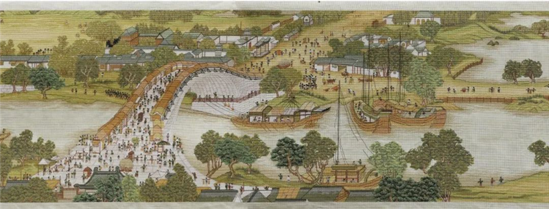 随着画面的展开,渐渐由静而动。汴河河道和两岸街市的出现,开始显出热闹的景象,岸上人烟渐稠,房屋渐密,河上舳舻相接,或空舟待返,或重载而行。