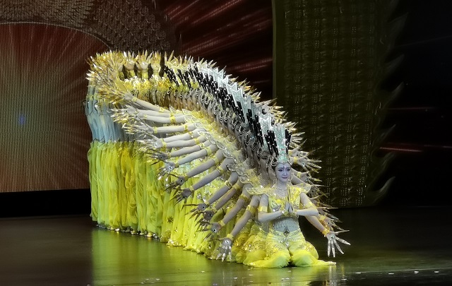 用曼妙的手语诉说梦想的意义,用优美的舞姿展现生命的精彩,用动人的音乐奏响千年文明璀璨乐章。大型情景音画剧《千手千眼》是以中国残疾人艺术团音乐舞蹈诗《我的梦》为蓝本、融合世界文化遗产敦煌莫高窟文化元素创编而成。剧目根据敦煌莫高窟现存《千手千眼观音》壁画创作,由50名听障舞者和视障乐手、歌手,通过音乐、舞蹈、器乐和多媒体等艺术表演形式,创新讲述“妙善救父”化身“千手千眼观音”的民间故事。中国残疾人艺术团艺术家们以丰富精湛的艺术语汇、大爱无疆的情感力量,向中外观众呈现一场具有鲜明敦煌特色、深厚人文情怀、独特审美的艺术盛宴。情景音画剧《千手千眼》的创排,是特殊艺术与敦煌旅游融合发展的新探索、新尝试,是中国残疾人艺术团首次结合旅游推出的驻场演出剧目。感人的故事,唯美的舞蹈,动人的旋律,绚丽的舞台,让特殊艺术与敦煌文化交相辉映,更好地展现敦煌文化之美。