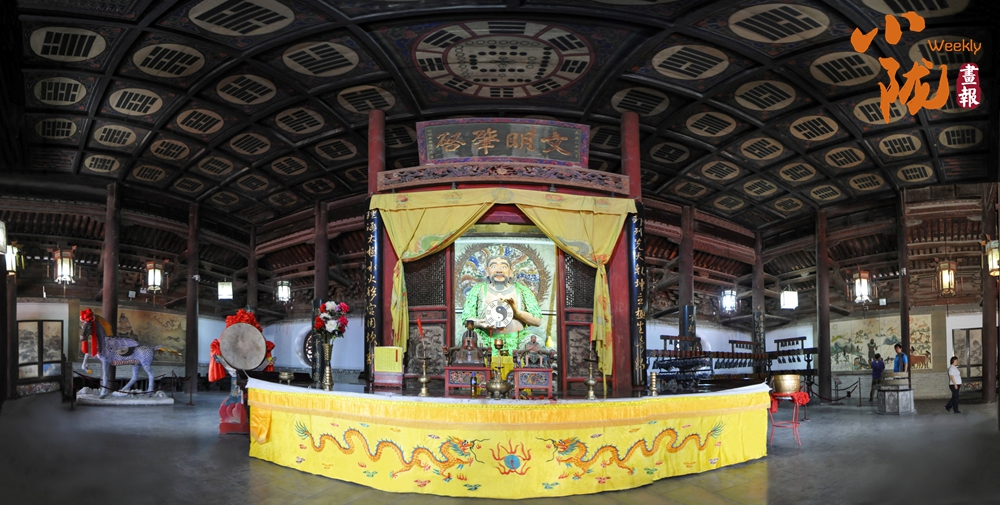 先天殿庄严肃穆,殿内正中便是高达3米的人文始祖伏羲坐身塑像,树叶披身,手持八卦盘,气宇轩昂,双目炯炯凝视前方,神龛上方悬挂着清嘉庆时州牧王赐均书“文明肇启”巨匾,仰头上望,顶上绘有河图洛书、六十四卦,令人肃然起敬。