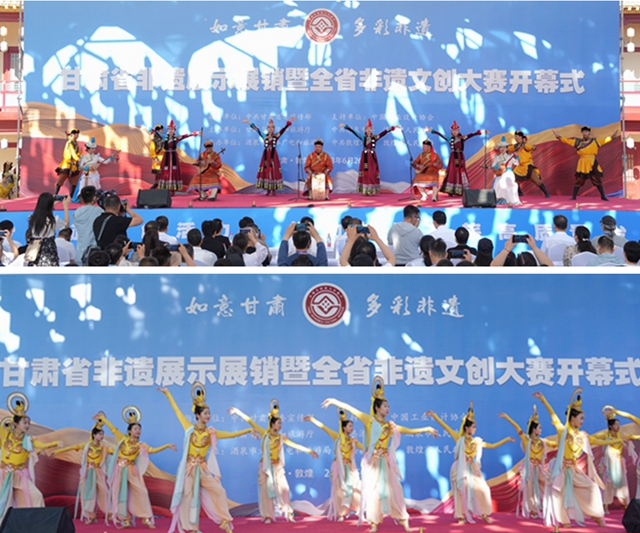 开幕式前,酒泉市安排舞蹈《丝路敦煌》、哈萨克民歌《牧羊马》、舞蹈《扬戏格》进行热场演出,充分展示非遗传承人良好的精神风貌。陶布秀尔乐舞《欢乐的陶布秀尔》、冬不拉弹唱《只要你走进哈萨克毡房》、瓜州民歌联唱《十二绣瓜州》、舞蹈《千手观音》四个非遗特色节目依次亮相开幕式演出,现场观众好评如潮。开幕式后,全体与会人员前往甘肃省非遗系统性保护成果展展区、甘肃省非遗工坊展示展销展区、甘肃省非遗影像展展厅、甘肃文旅暨非遗文创大赛展厅,实地参观了解全省非遗系统性保护取得的丰硕成果,与各级非遗传承人互动交流,观看《甘肃非遗》宣传片,专家现场评选“甘肃文旅暨非遗文创大赛”作品。