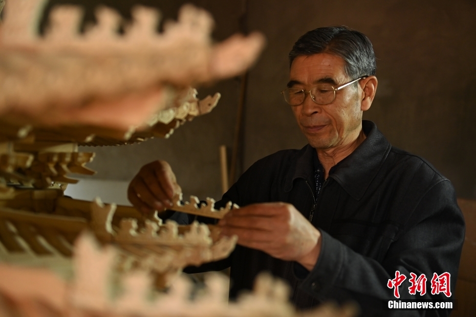 6月27日,甘肃省金昌市永昌县一民居内,年过七旬的古建筑营造技艺“守”艺人杨万年为自己制作的微缩版北京故宫角楼精雕脊兽。