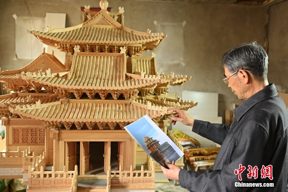 6月27日,甘肃省金昌市永昌县一民居内,年过七旬的古建筑营造技艺“守”艺人杨万年为自己制作的微缩版北京故宫角楼按照片进行微调。