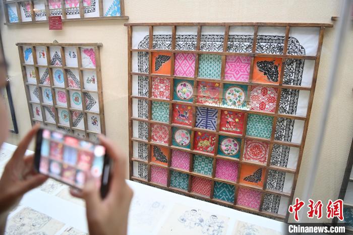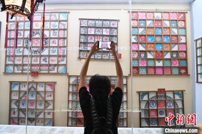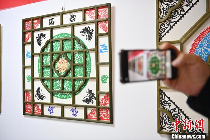 窗花是中国古老的传统民间艺术,已有上千年的历史。图为游客拍摄传统窗花展。 高莹 摄