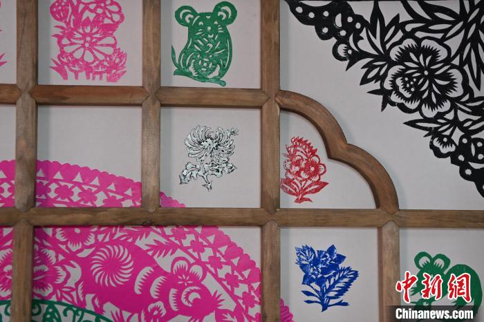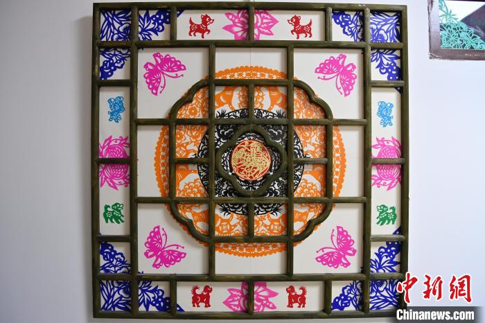 近日,甘肃省定西市安定区文化馆内,墙上整齐地挂满几十余幅农家传统木窗,每个木窗的格子之间贴满了颜色多样、小巧精致的剪纸图案,让原本不起眼的传统木窗上“繁花盛开”。