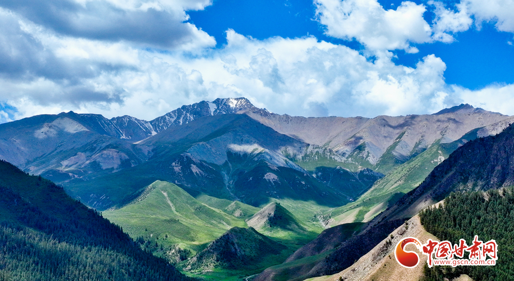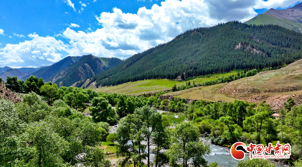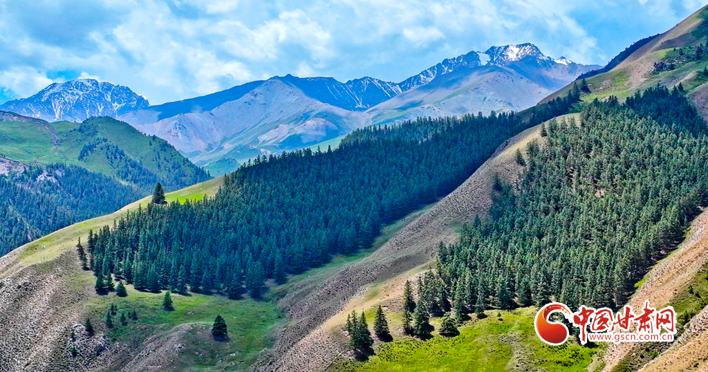 6月29日,在祁连山国家公园甘肃省张掖市肃南裕固族自治县大河乡段,蓝天白云下,巍峨壮丽的祁连山苍松翠柏,水光粼粼,构成一幅美丽的画卷。