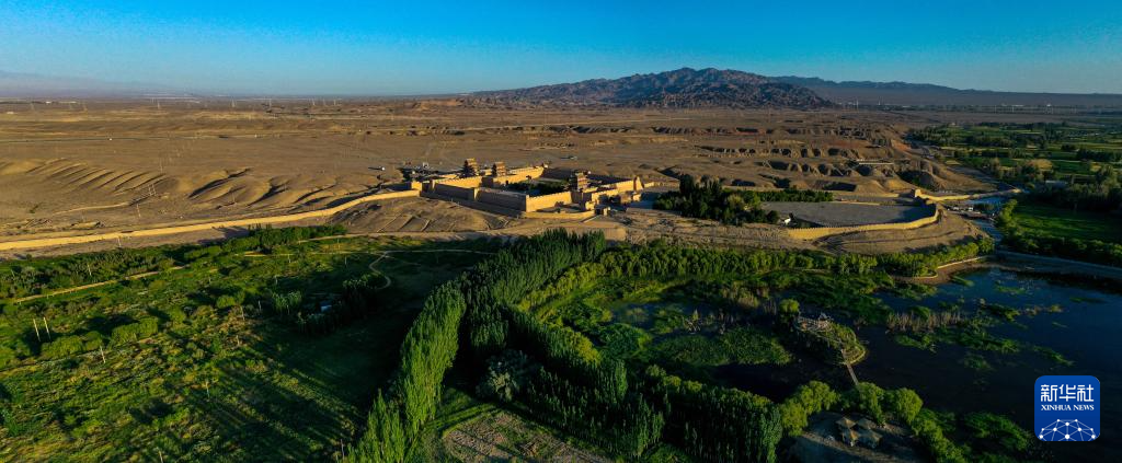 这是7月14日在甘肃省嘉峪关市拍摄的嘉峪关关城景区(无人机照片,拼接照片)。新华社记者 刘金海 摄