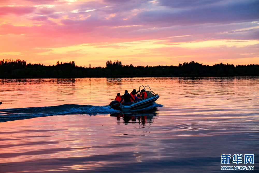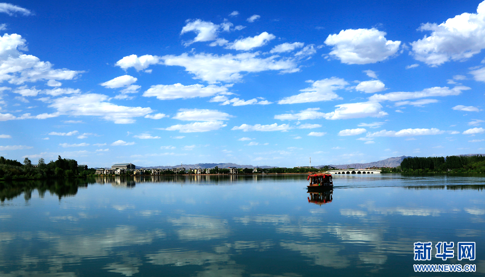 7月16日,在甘肃省张掖市甘州区芦水湾生态旅游度假区,游客乘画舫在云中湖、居延湖中游览享清凉。新华网发(陈礼 摄)
