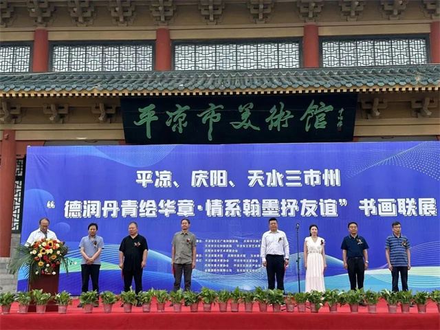 7月26日上午,由平凉市文化广电和旅游局、庆阳市文体广电和旅游局、天水市文化和旅游局主办,平凉市美术馆、庆阳市美术馆、天水美术馆承办,平凉市文化旅游产业投资集团有限责任公司、平凉市美术家协会、平凉市书法家协会、庆阳市美术家协会、东关街道宝塔社区协办的平凉、庆阳、天水三市州“德润丹青绘华章·情系翰墨抒友谊”书画联展在平凉市美术馆盛大开展。