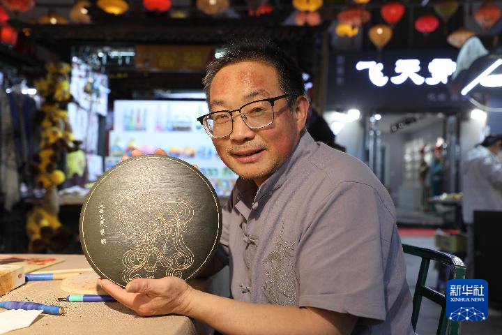 6月1日,敦煌木雕画代表性传承人申洪杰在工作室展示木雕画作品《反弹琵琶》。新华社记者 张智敏 摄