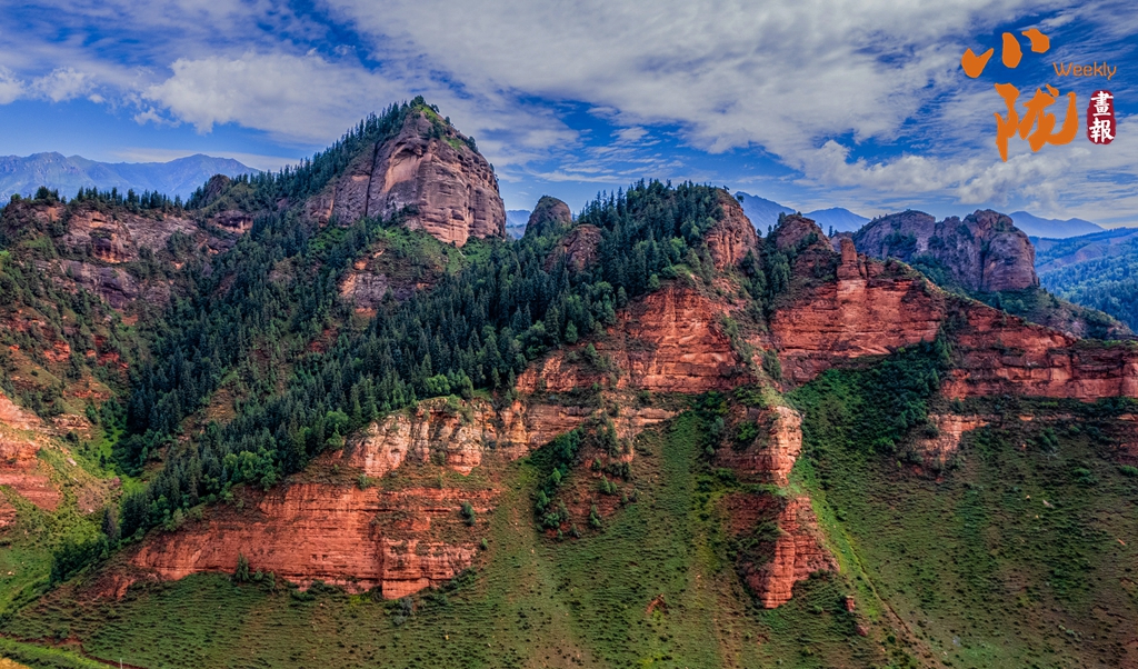 在蓝天白云的映衬下,从高处远眺,本康丹霞高低错落、千姿百态,构成一幅绚丽多彩,气势磅礴的壮美画卷。