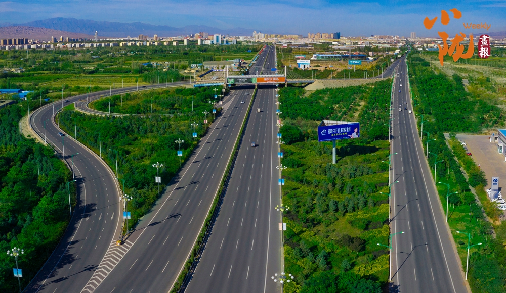 宽阔的马路、整齐的楼房、绿色的植被、蓝色的湖泊、远处的祁连……