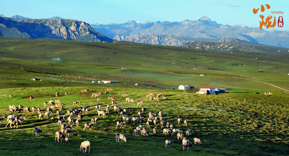 祁连山下绿草如茵,牛羊点缀其中,别具风情。