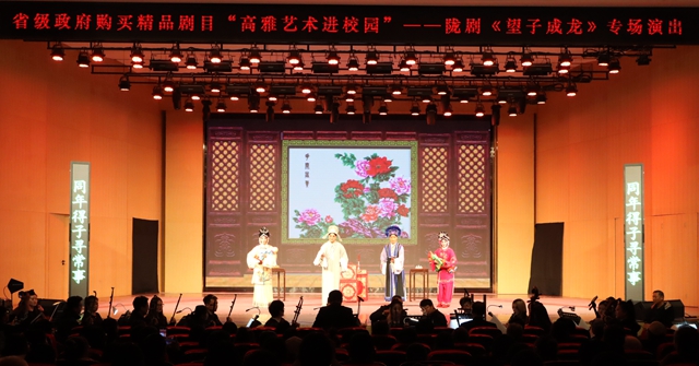 戏曲进校园,传承在身边。为贯彻落实省委宣传部、省文旅厅关于《甘肃省高雅艺术进校园实施方案》的通知精神,进一步弘扬地方特色传统文化,培养大学生的审美情趣和艺术素养,增强年轻人的文化自觉和文化自信,10月18日晚,省级政府购买精品剧目“高雅艺术进校园”——陇剧《望子成龙》专场演出在西北师范大学云亭校区音乐厅开演,为全院师生带来一场传统戏曲盛宴。