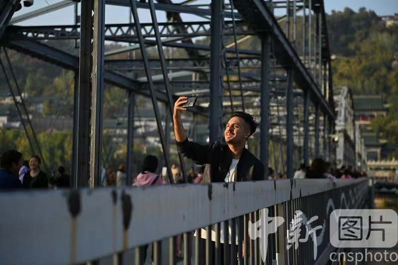 10月23日,兰州理工大学留学生潘迪通过社交平台向朋友分享甘肃兰州标志性建筑中山桥。2001年出生的潘迪来自于尼泊尔加德满都,在中国的4年时光里,他喜欢上了中文说唱,通过练习他已是学校小有名气的说唱歌手。同时,他还利用短视频的方式传播中国的说唱文化和传统文化。 中新社记者 李亚龙 摄