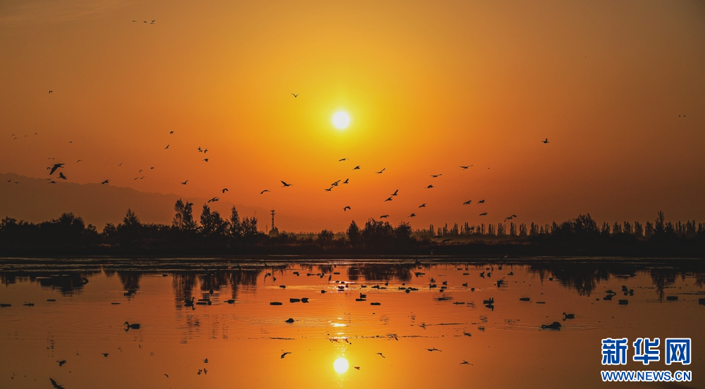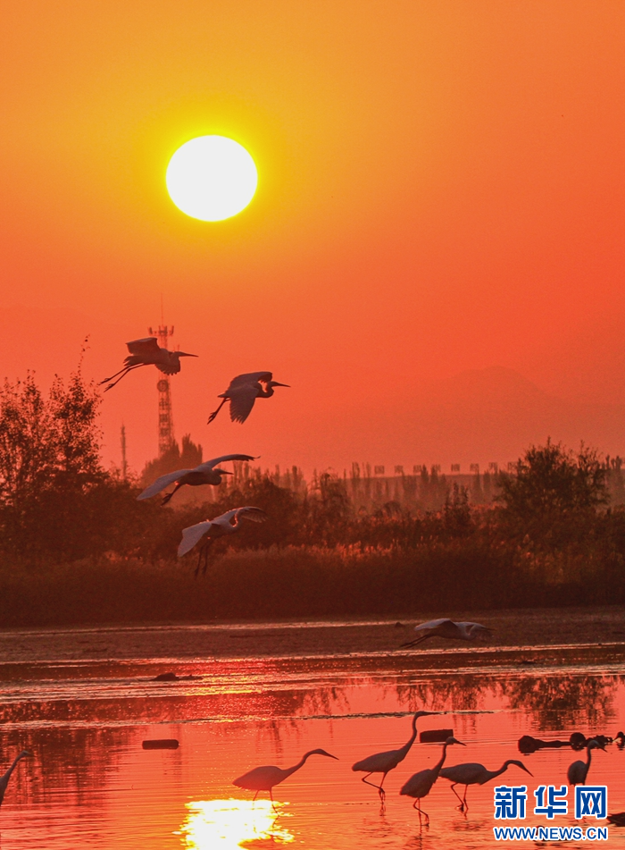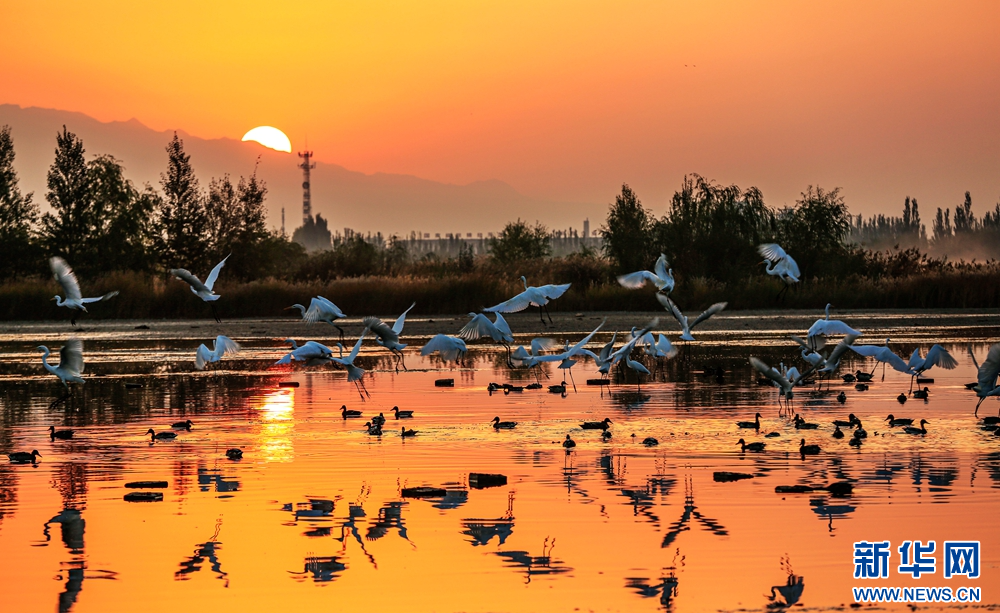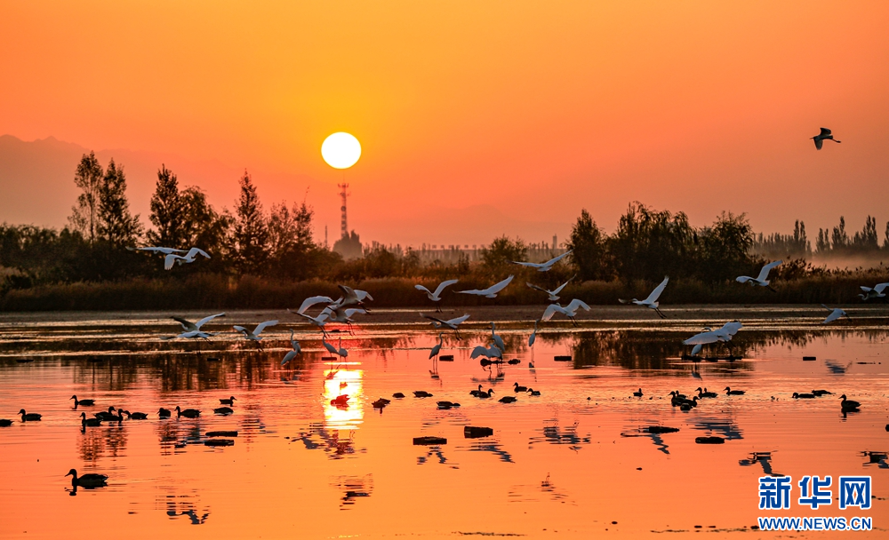 近日,在甘肃省张掖国家湿地公园,成群的白鹭迎着朝阳悠然自得地飞翔、觅食、嬉戏,构成了一幅朝阳伴鹭飞的美丽画卷。新华网发(陈礼 摄)