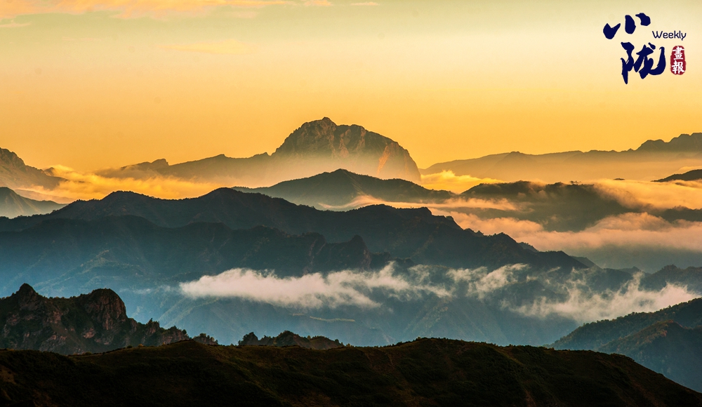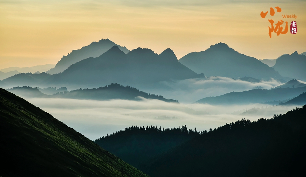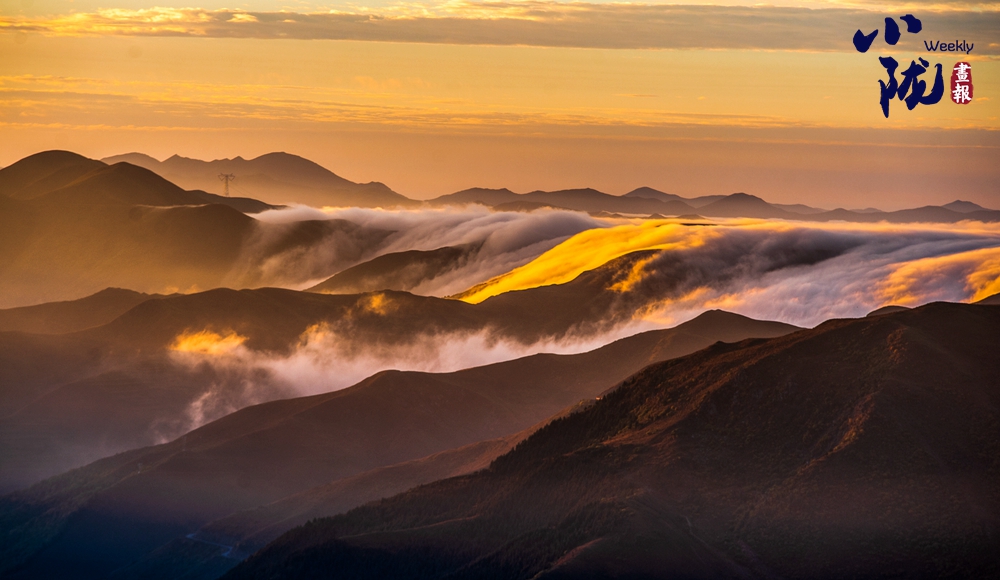 日落时分,璀璨的金光弥漫天际,云雾在山间翻滚流淌,犹如瀑布般倾泻,令人叹为观止。