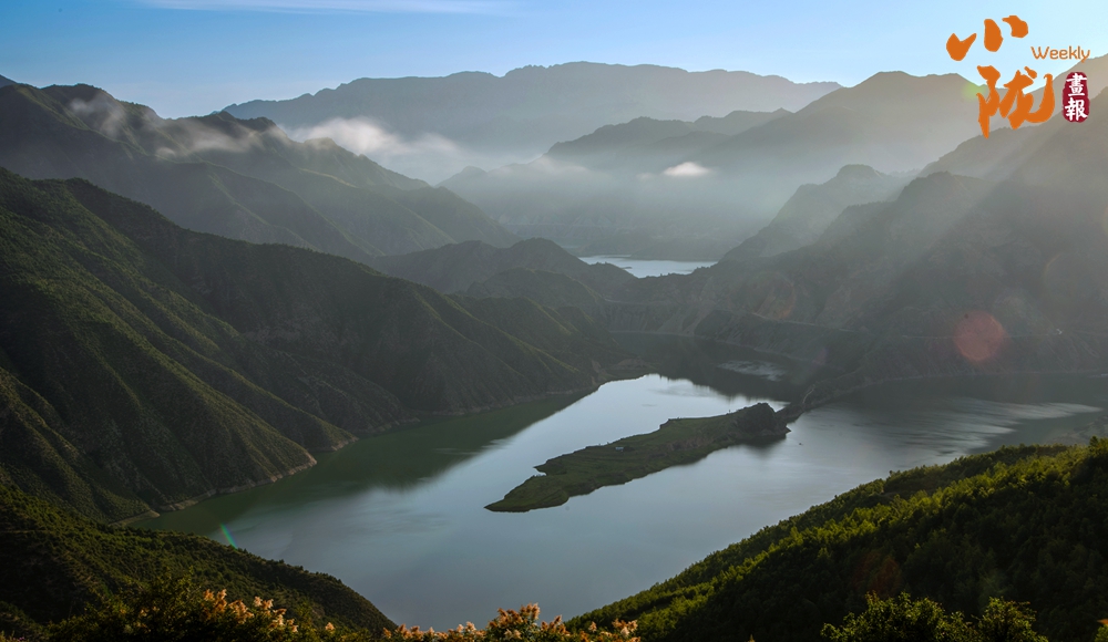 在初升的太阳面前,洮河上空云雾缭绕,远山层层叠叠,犹如人间仙境。