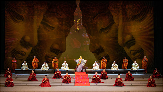 《玄奘西行》作为我国第一部民族器乐剧,既是民族器乐的集中展现,也生动讲述了玄奘西行的历史故事。剧目以“戏剧”与“乐器”作为叙事主体,通过笛、箫、胡琴、琵琶、唢呐、阮、箜篌、艾捷克、热瓦普、冬不拉、库布孜、萨塔尔、手鼓、鹰笛以及新疆木卡姆演唱等集中呈现,彰显了汉族、维吾尔族、哈萨克族、塔吉克族等风格特征的音乐文化,充分展现了丝绸之路沿线各民族音乐在历史的陶冶、沉淀、融合中兼收并蓄、形式多样、内容丰富的多元文化特质。剧目突出音乐的抽象叙事功能,以“大乘天”“佛门”“一念”“潜关”“问路”“遇险”“极乐”“高昌”“普渡”“雪山”“祭天”“菩提”“那烂陀”“如梦”“大唐”15个章节为架构,运用多媒体视角和舞美技术建构虚实空间,淋漓尽致地彰显出一代宗师玄奘西行舍身求法、执着信念、坚忍不拔的伟大精神。