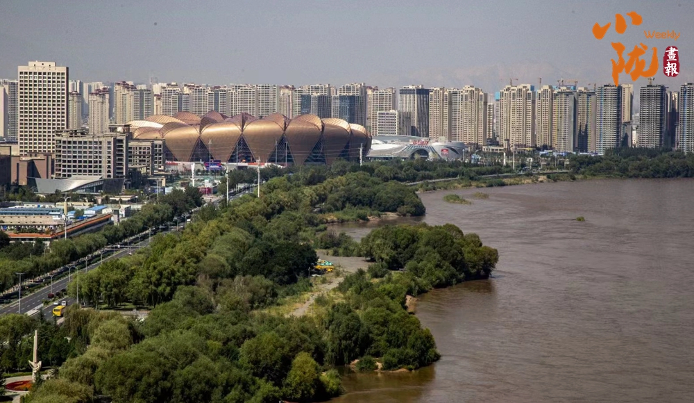 黄河奔流,沿岸的湿地公园植被丰茂,两岸树木林立,绿意盎然。新建的奥体中心“一场三馆”集体亮灯,如艳丽玫瑰般盛开于黄河之畔……