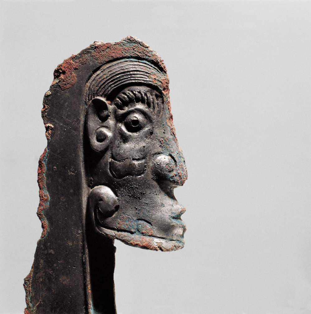此青铜戟高25.5厘米,宽23厘米。人头形,颈部有椭圆形浅銎,援基饰一牛首,阴刻牛头形徽识。人头浓眉巨目,披头卷须,腮部有纹饰。