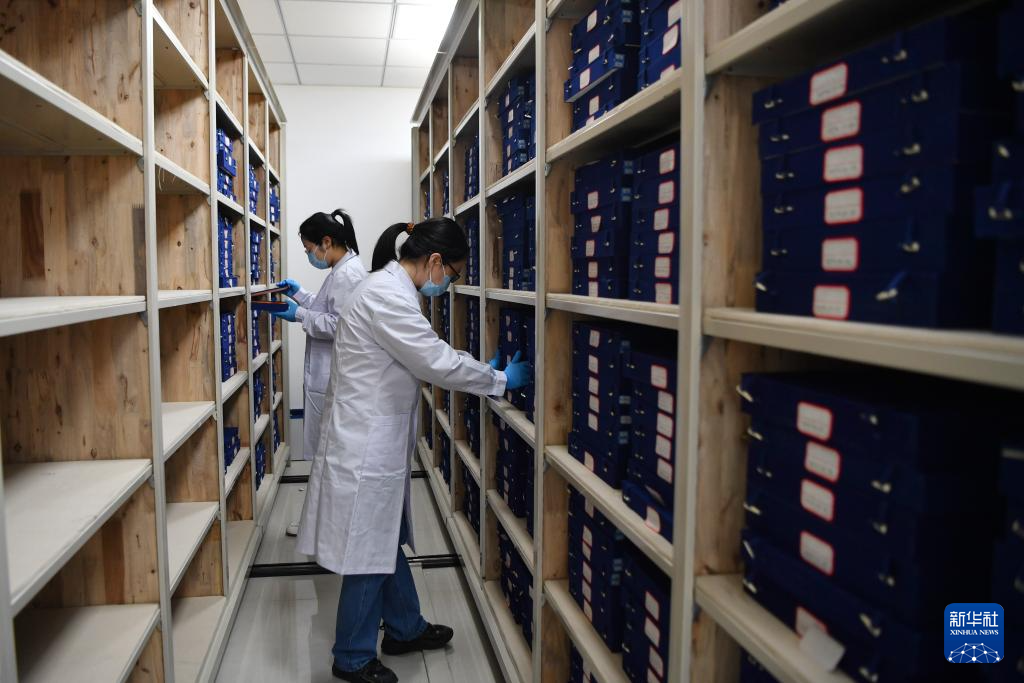 甘肃简牍博物馆科技保护部文物库房管理员杨升(右)和同事常晓丽在整理登记简牍信息(10月26日摄)。新华社记者 陈斌 摄
