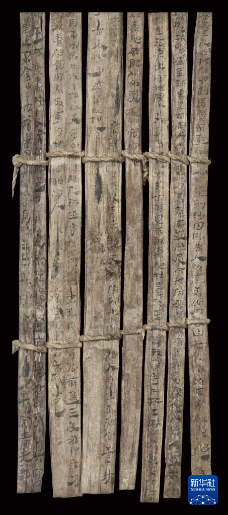 汉简《康居王使者册》。此简记载了西域康居国使者前来“进贡”骆驼,抵达敦煌遇到不公后反映问题,朝廷受理解决的经过。新华社发(甘肃简牍博物馆供图)