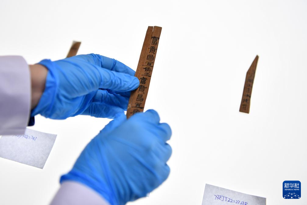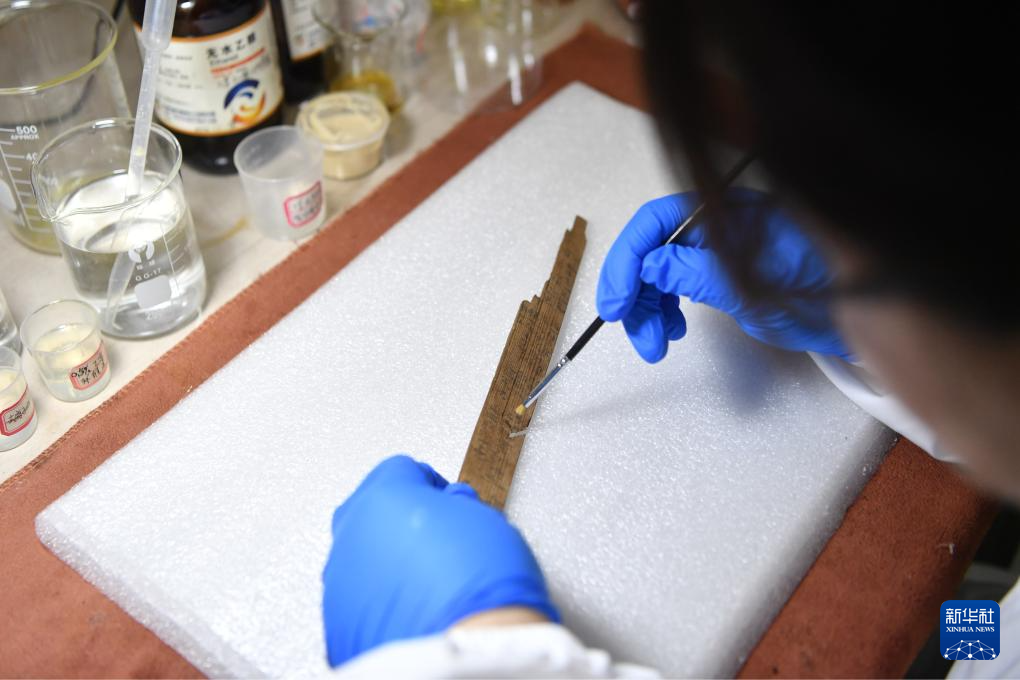 甘肃文博服务中心文物修复师李媛在清理待修复的简牍(10月26日摄)。新华社记者 陈斌 摄