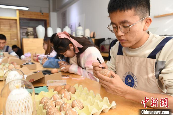 图为兰州资源环境职业技术大学民族工艺学院学生在学习蛋雕技艺。戴文昌 摄
