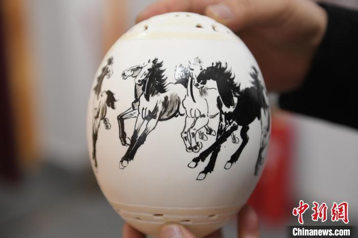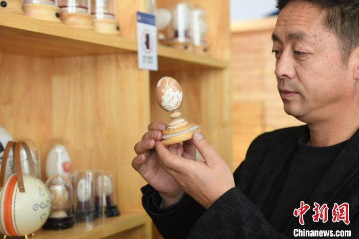 图为兰州资源环境职业技术大学民族工艺学院老师展示蛋雕作品。戴文昌 摄
